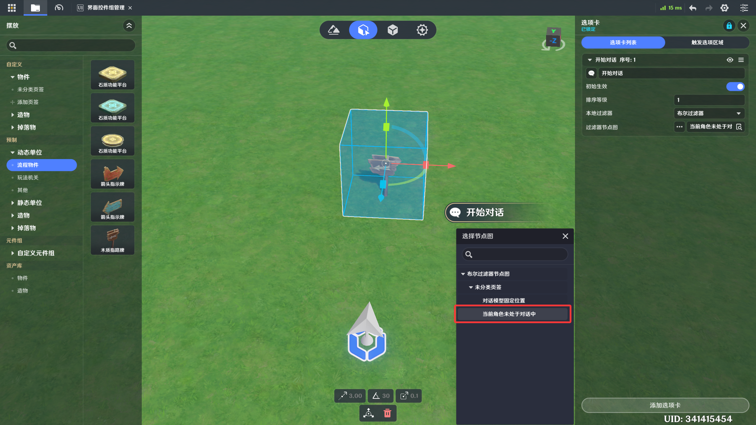 - 为这个动态物件配置选项卡组件。注:请为选项卡配置布尔过滤器「当前角色未处于对话中」,否则玩家在对话过程中仍然能够交互选项卡。