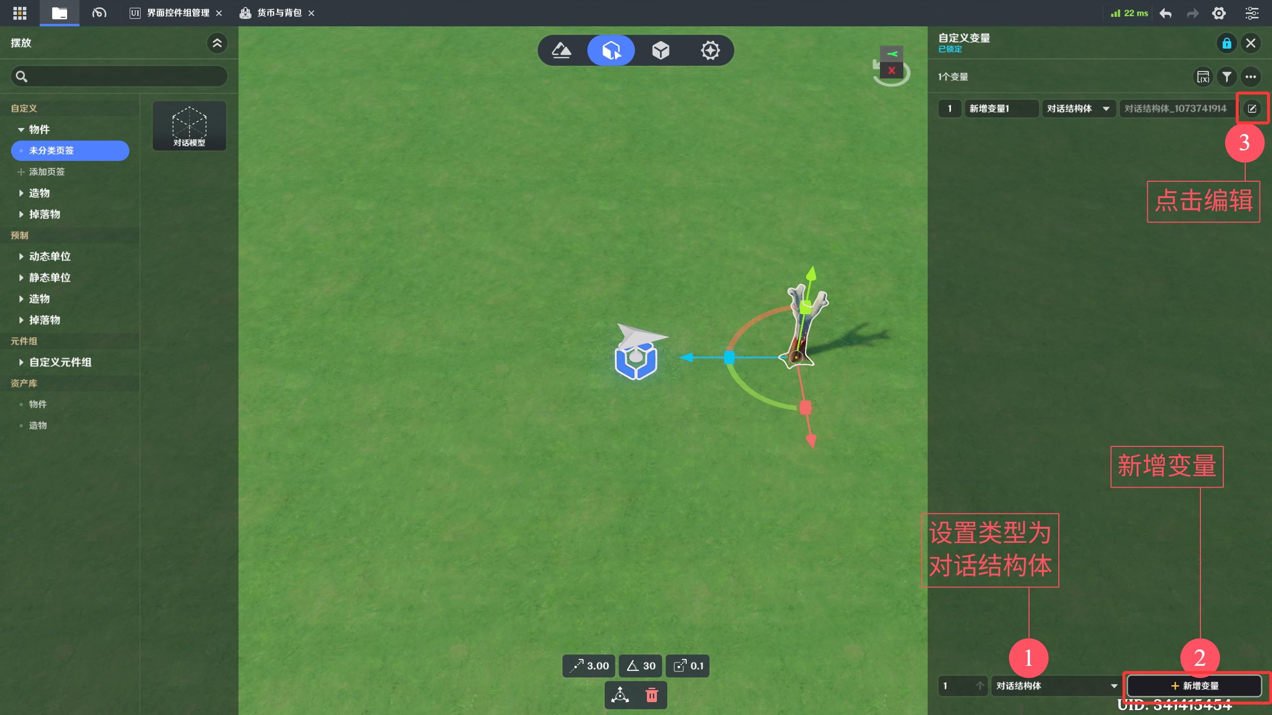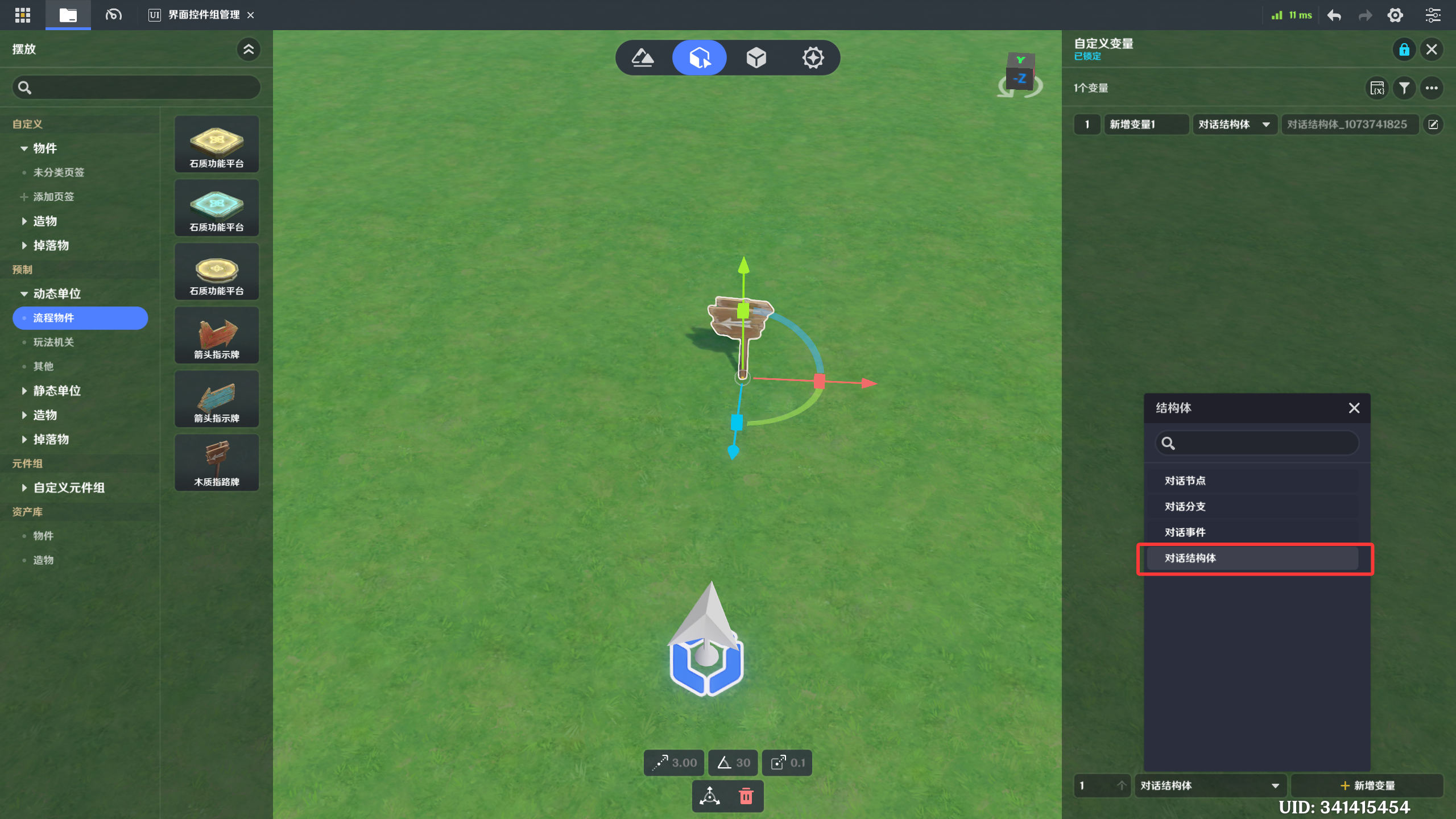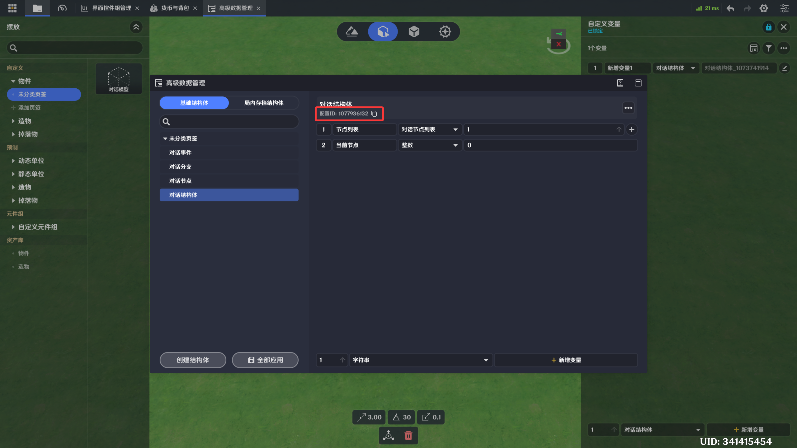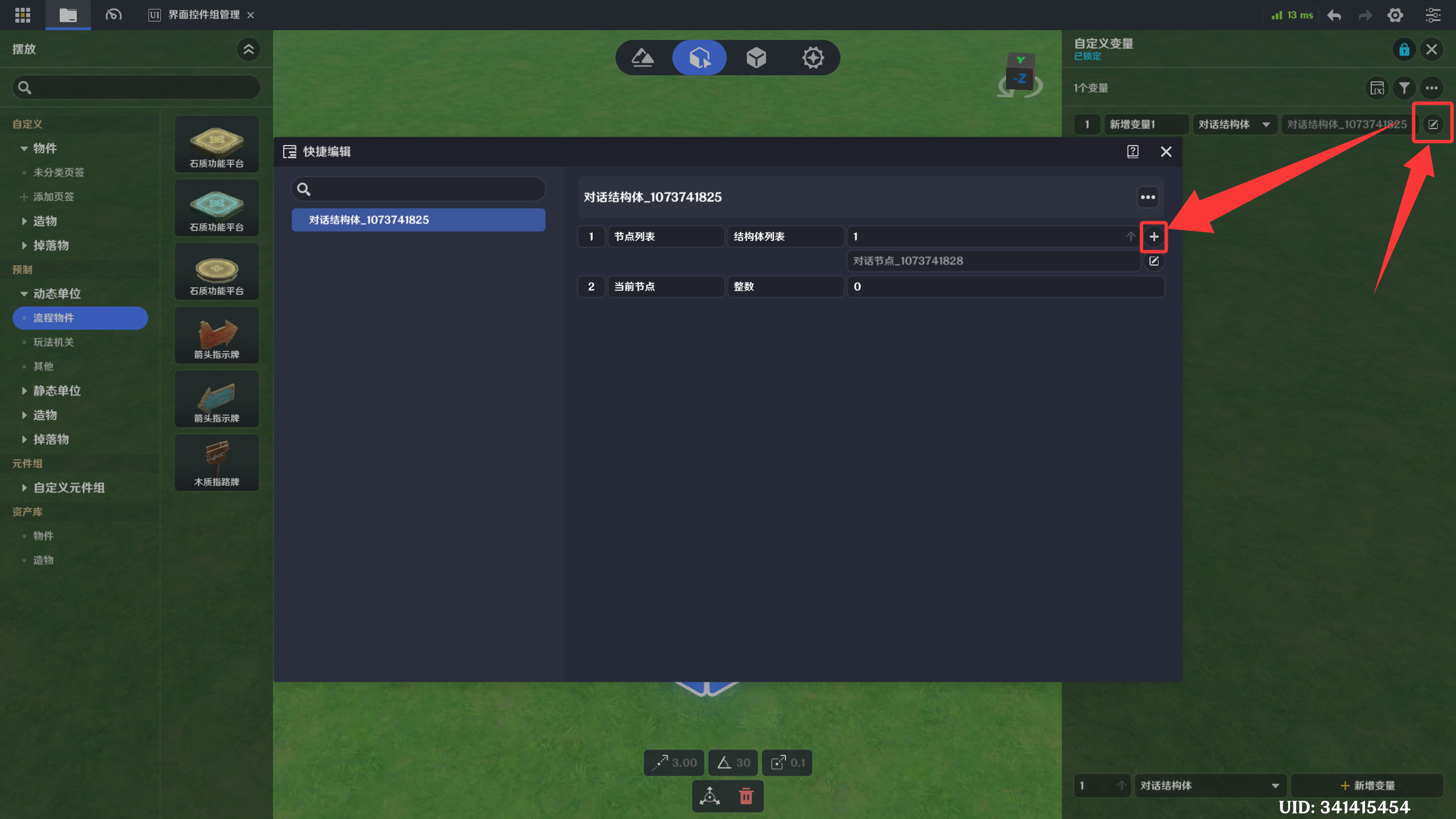- 在原神千星奇域编辑器内任意一个实体(推荐在你的对话事件承载实体)的自定义变量组件中,创建一个类型为「对话结构体」的自定义变量,然后点击按钮打开编辑界面。