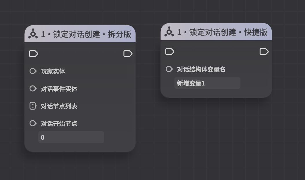 此外,你还可以使用「拆分版」和「快捷版」的复合节点创建对话。「拆分版」允许你传入拆分后的对话结构体参数创建对话(包含节点列表和开始节点索引);「快捷版」为单人奇域提供了更加快捷的对话创建方式,调用「快捷版」节点会为单人游戏的唯一玩家创建对话,对话事件承载实体为挂载「快捷版」复合节点的实体。
