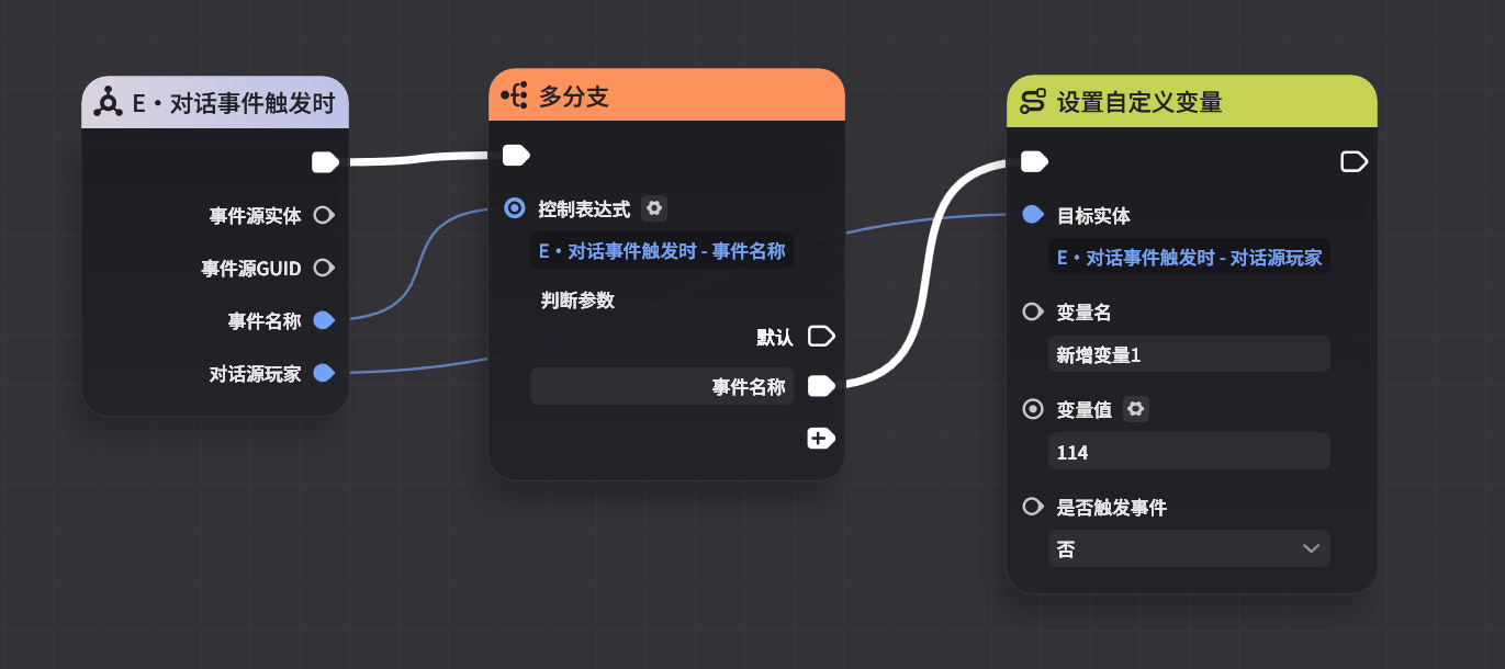 可在对话事件实体上使用「E·对话事件触发时」复合节点接收事件,并用多分支控制不同事件名称执行不同逻辑。