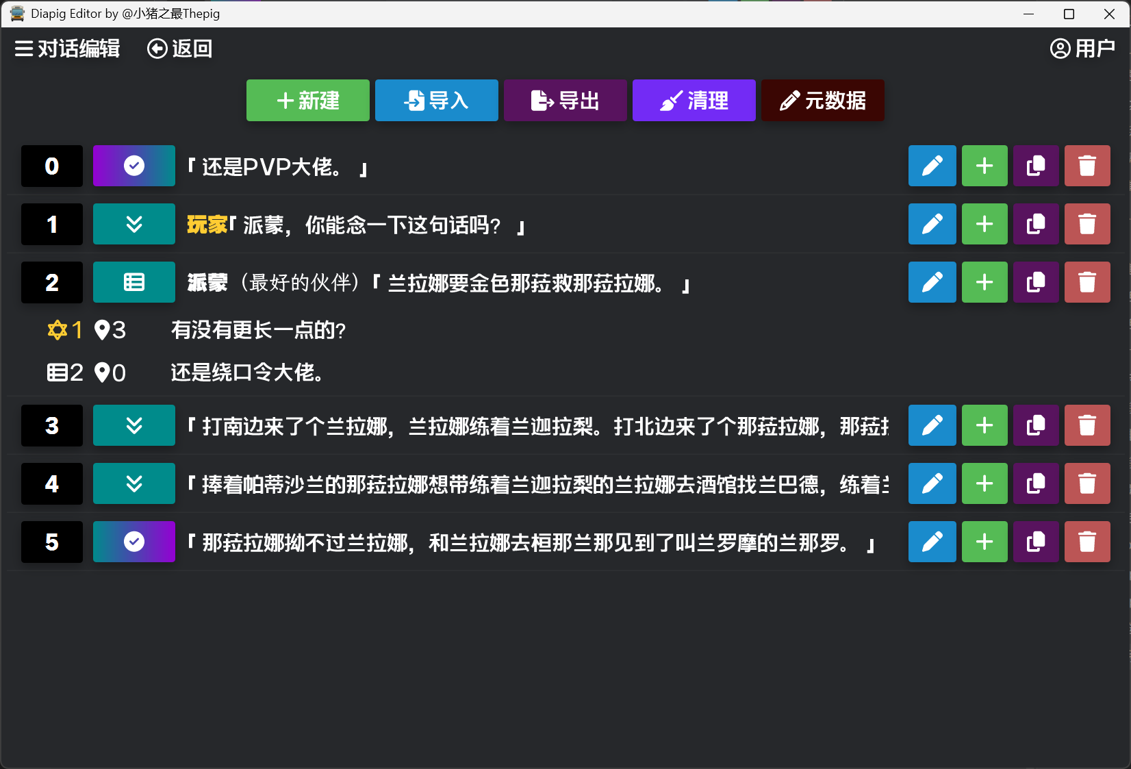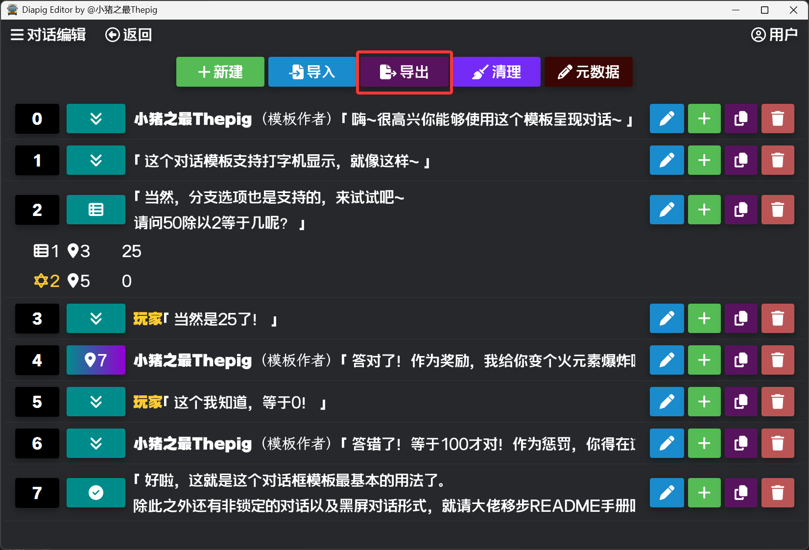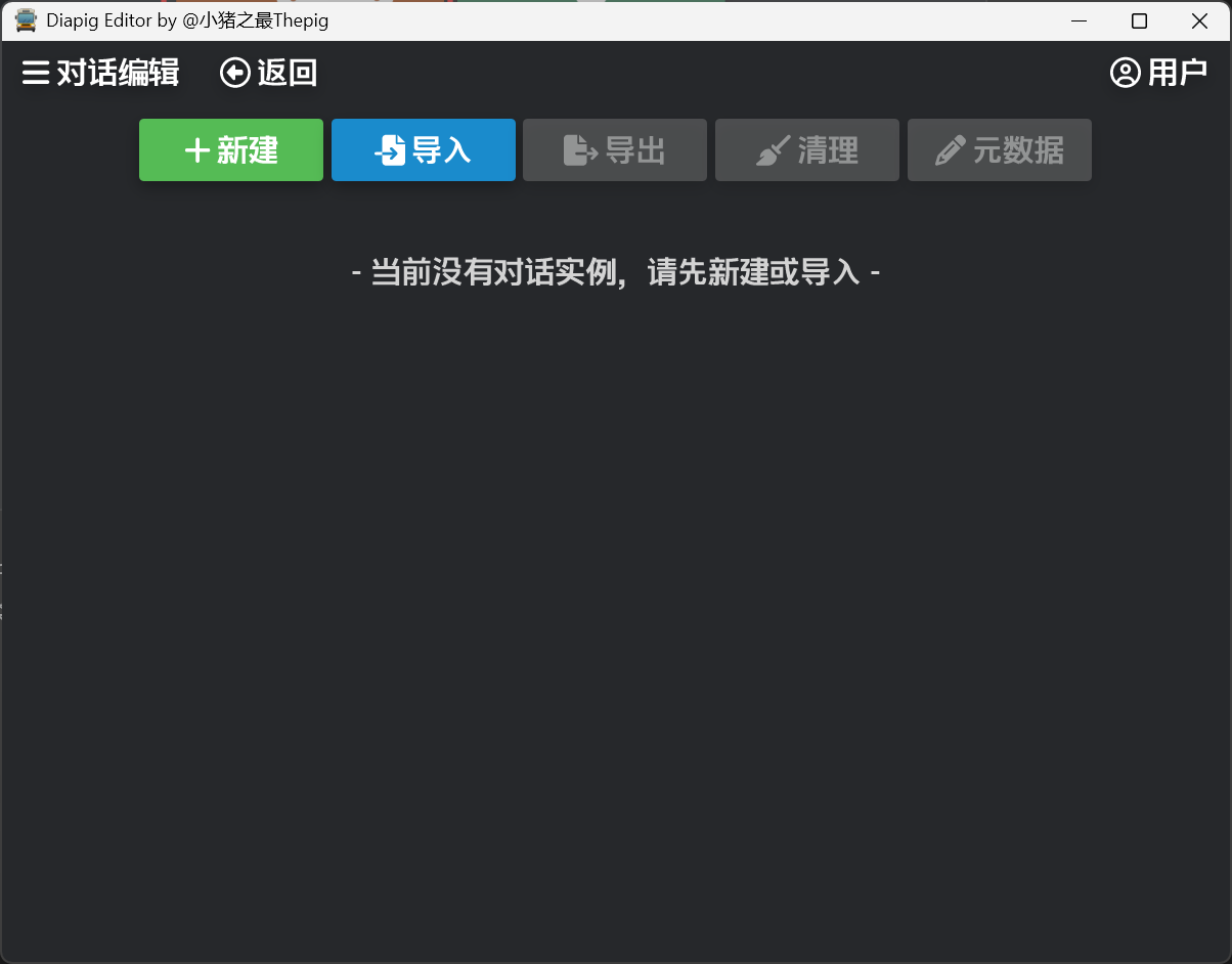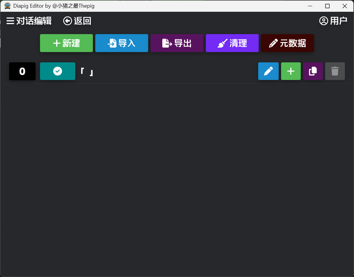每次打开 Diapig Editor 编辑对话前,不要使用新建按钮!先导入文件!导出对话文件后,编辑下一个对话时即可使用新建按钮新建对话。