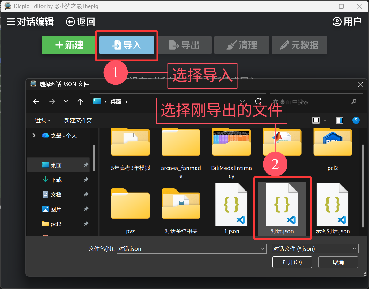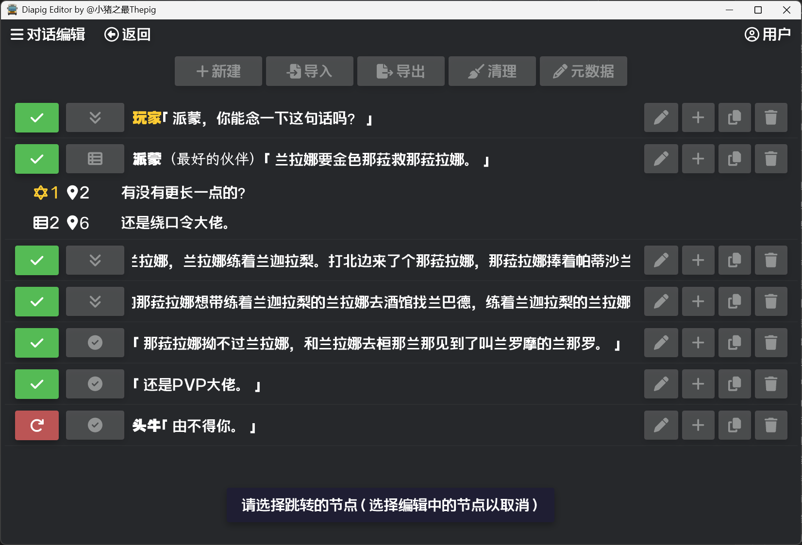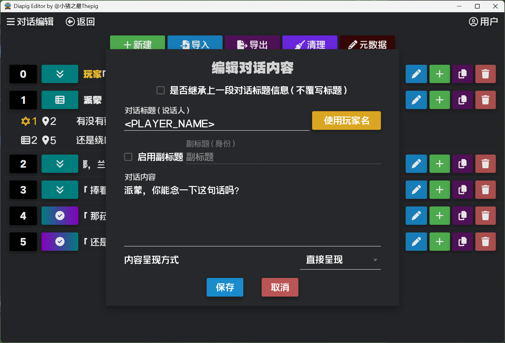 每次打开 Diapig Editor 编辑对话前,不要使用新建按钮!先导入文件!导出对话文件后,编辑下一个对话时即可使用新建按钮新建对话。
