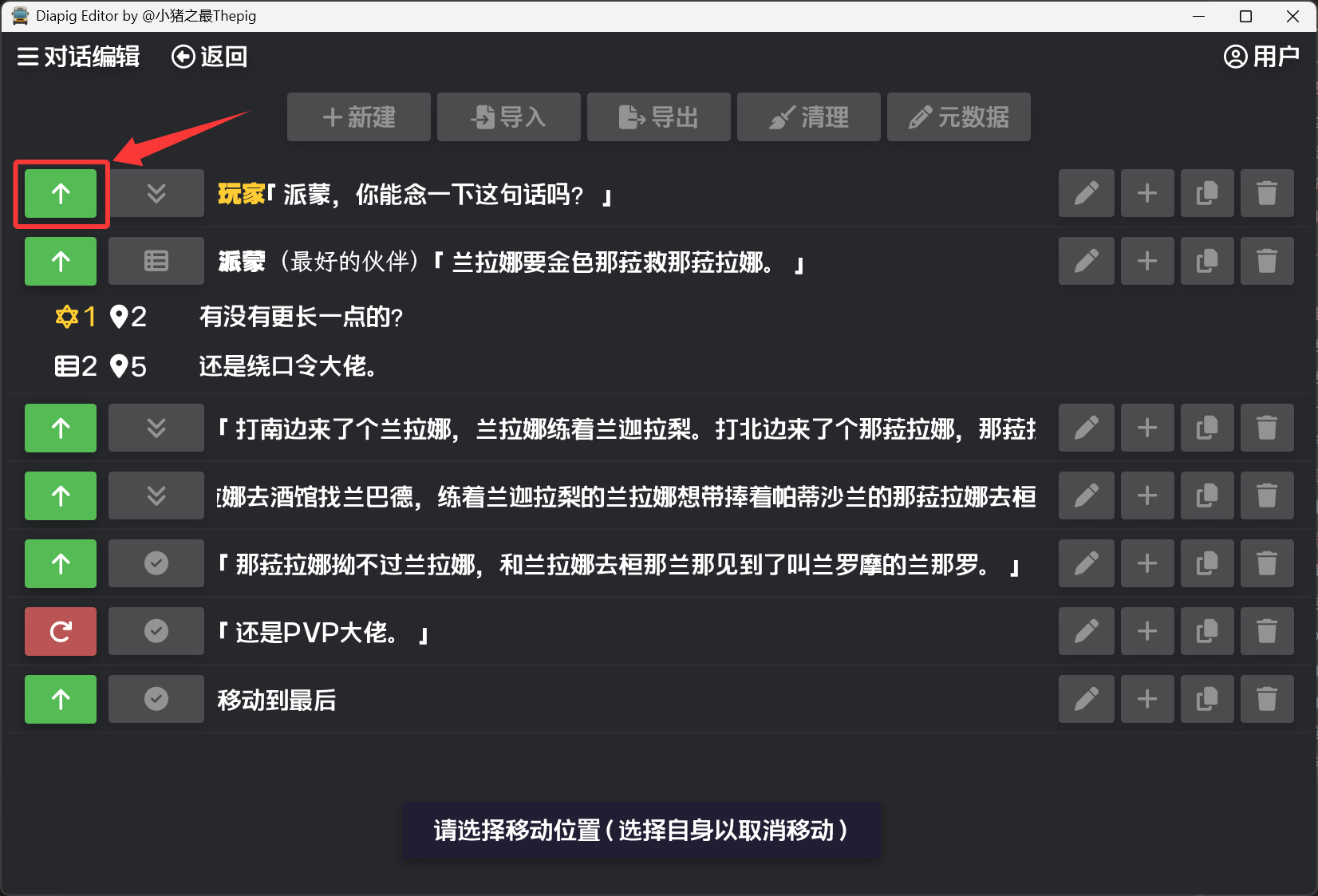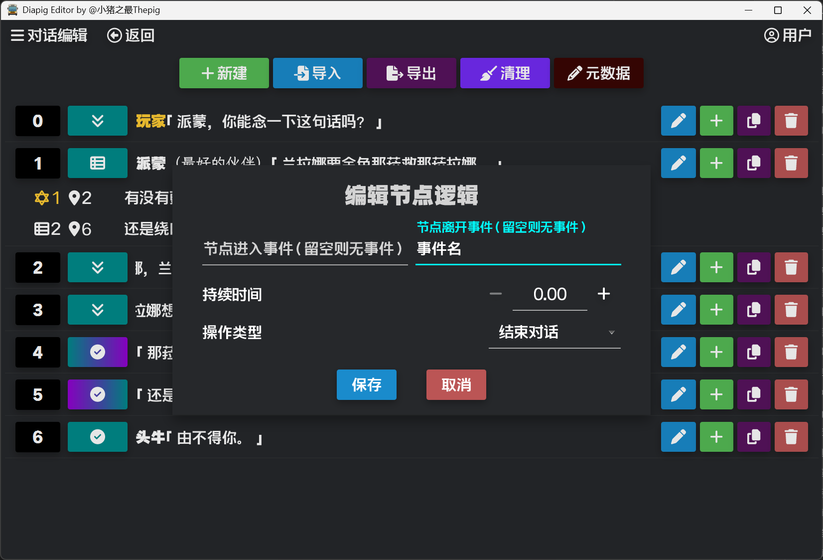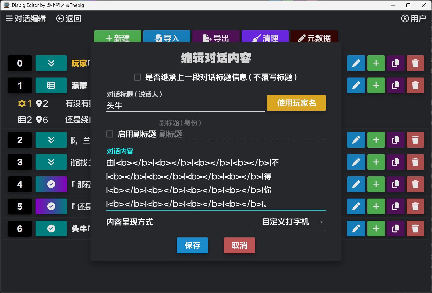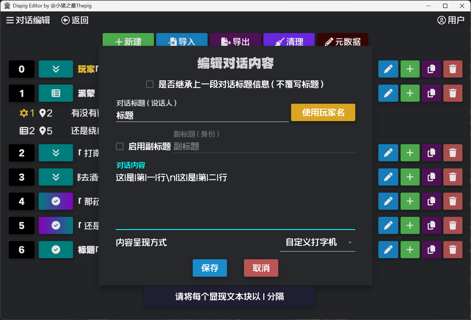 每次打开 Diapig Editor 编辑对话前,不要使用新建按钮!先导入文件!导出对话文件后,编辑下一个对话时即可使用新建按钮新建对话。
