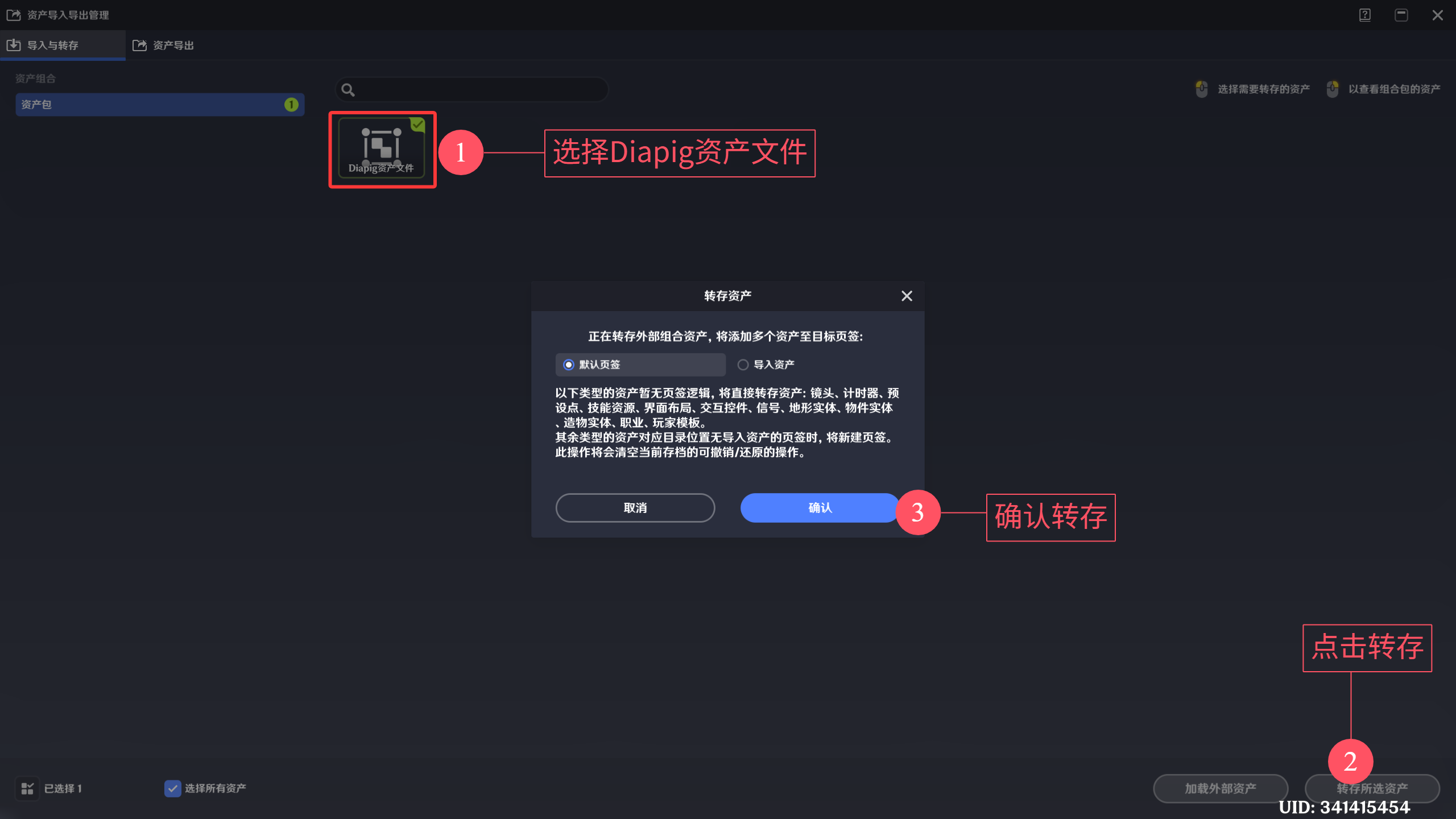 - 最后选中「Diapig资产文件」,点击右下角「转存所选资产」即可导入 Diapig 的所有相关内容。