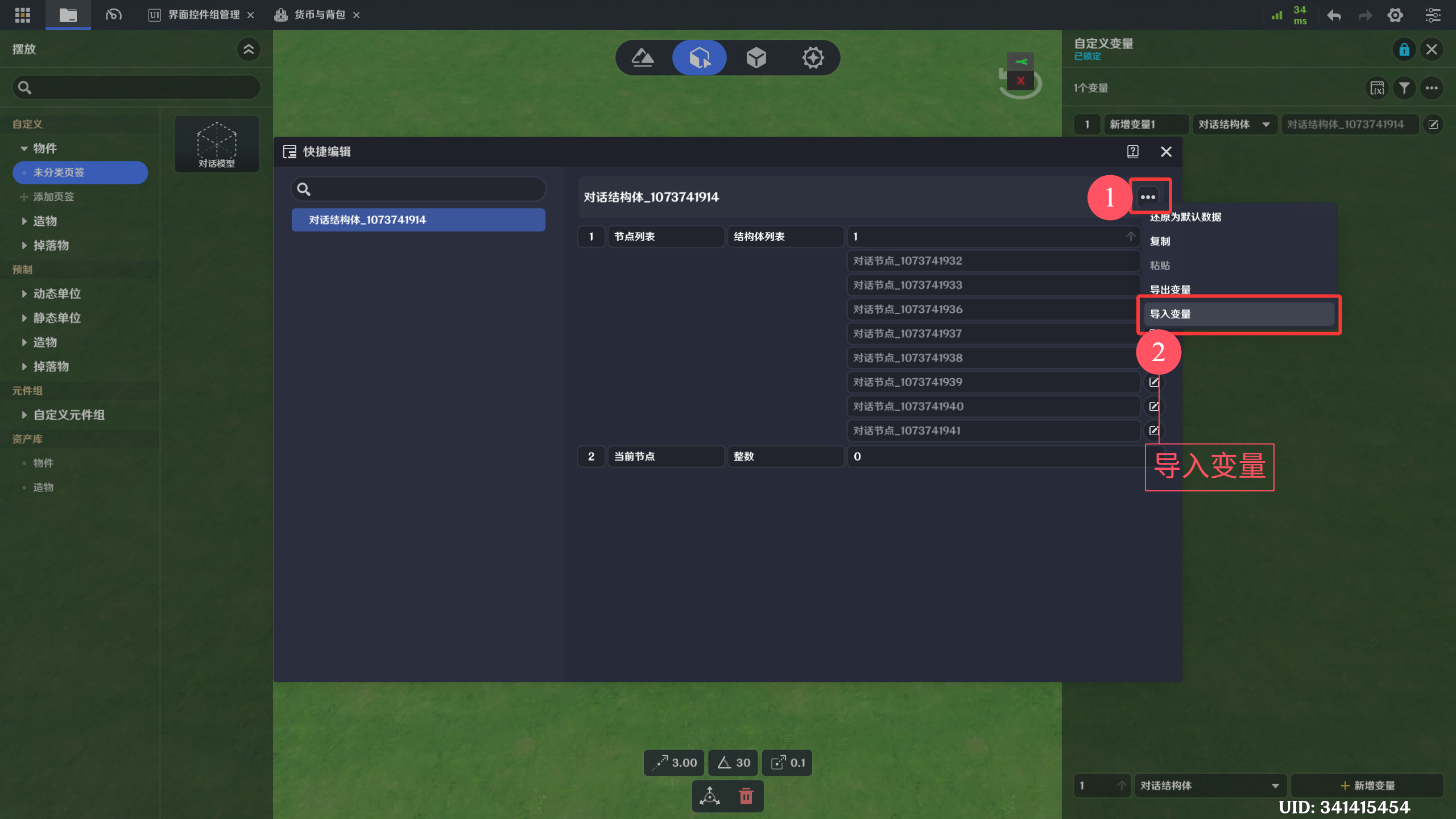 - 在原神千星奇域编辑器内,刚才的变量「快捷编辑」界面中,再次点击右上角「…」-「导入变量」,选择刚才从 Diapig Editor 中导出的 JSON 文件,即可将对话导入游戏中。