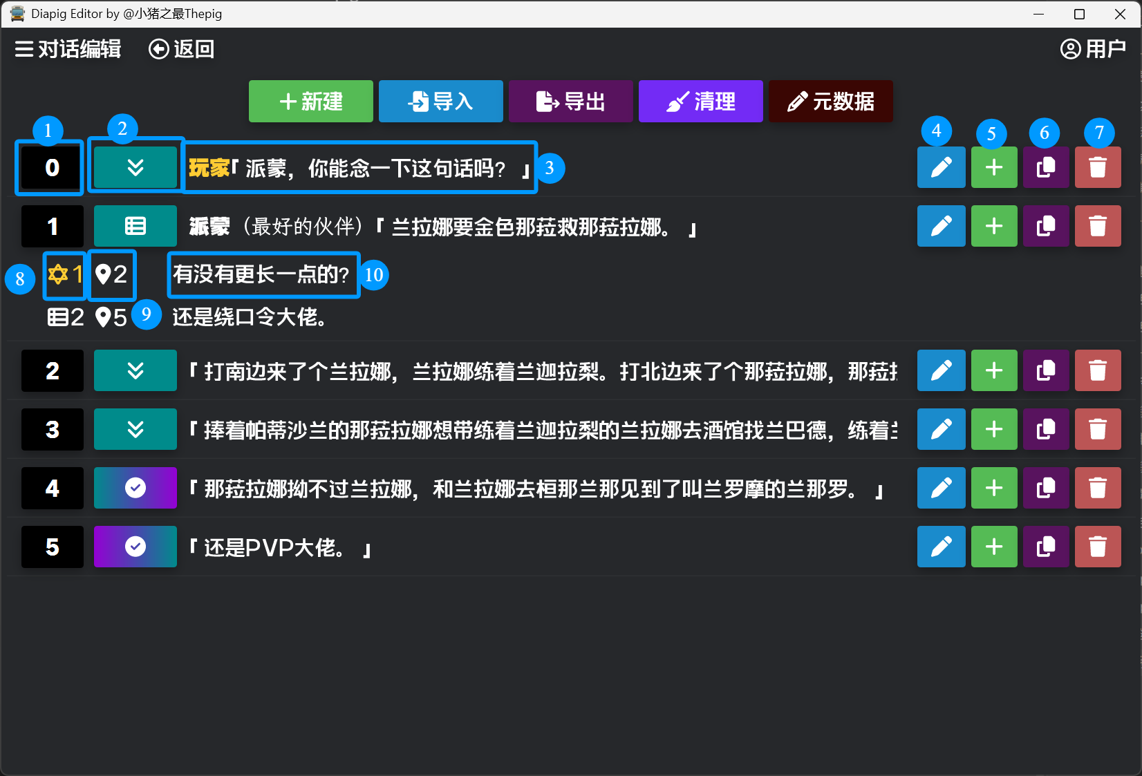 Diapig Editor 中展示了该对话结构体内所有的对话节点(每两条分割线之间为一个节点),因此操作基本也围绕对话节点进行。