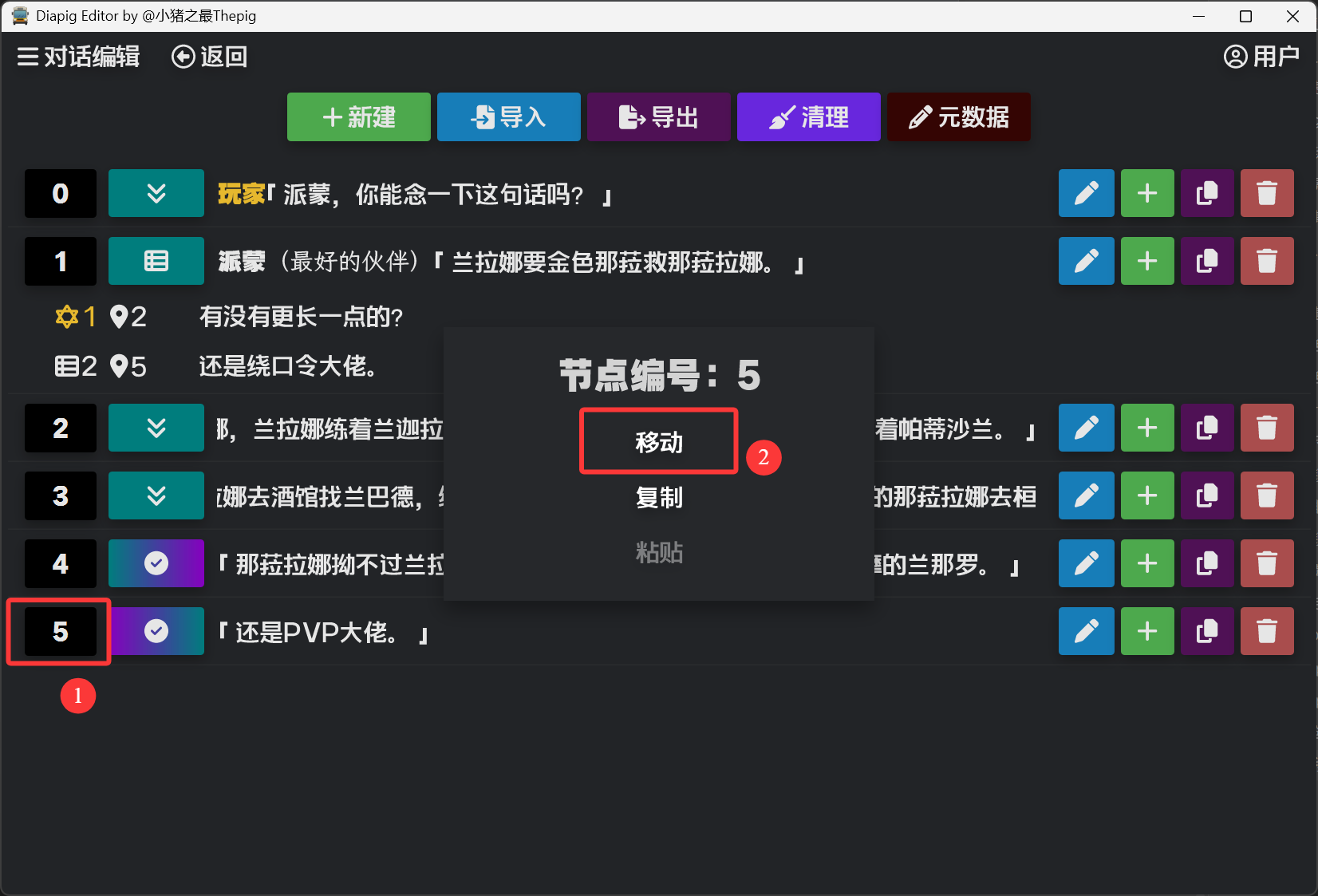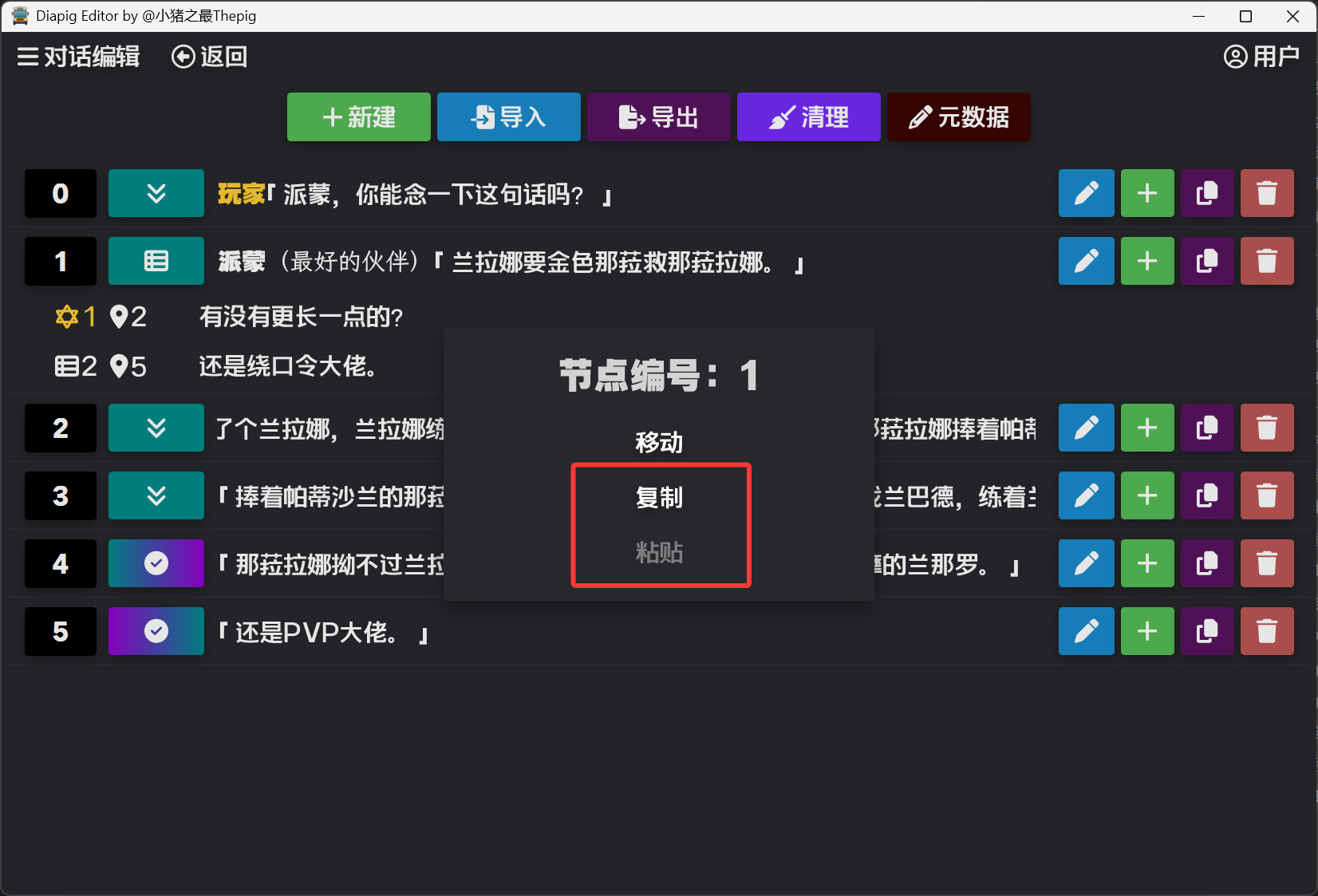 - 对话节点索引按钮,可移动、复制与粘贴节点内容,在选择模式下用于选取目标节点。