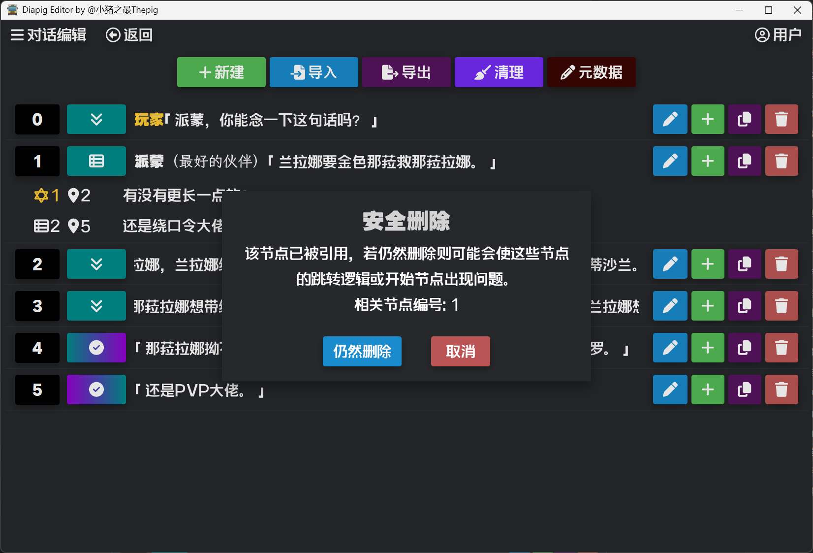 添加(插入)与移除节点不会使其他节点的跳转目标发生变化,Diapig Editor 在添加和移除节点时会自动处理已有节点的跳转索引使得跳转目标与添加/移除前一致。但如果尝试移除一个其他节点的跳转目标,会弹出如下弹窗请求二次确认。