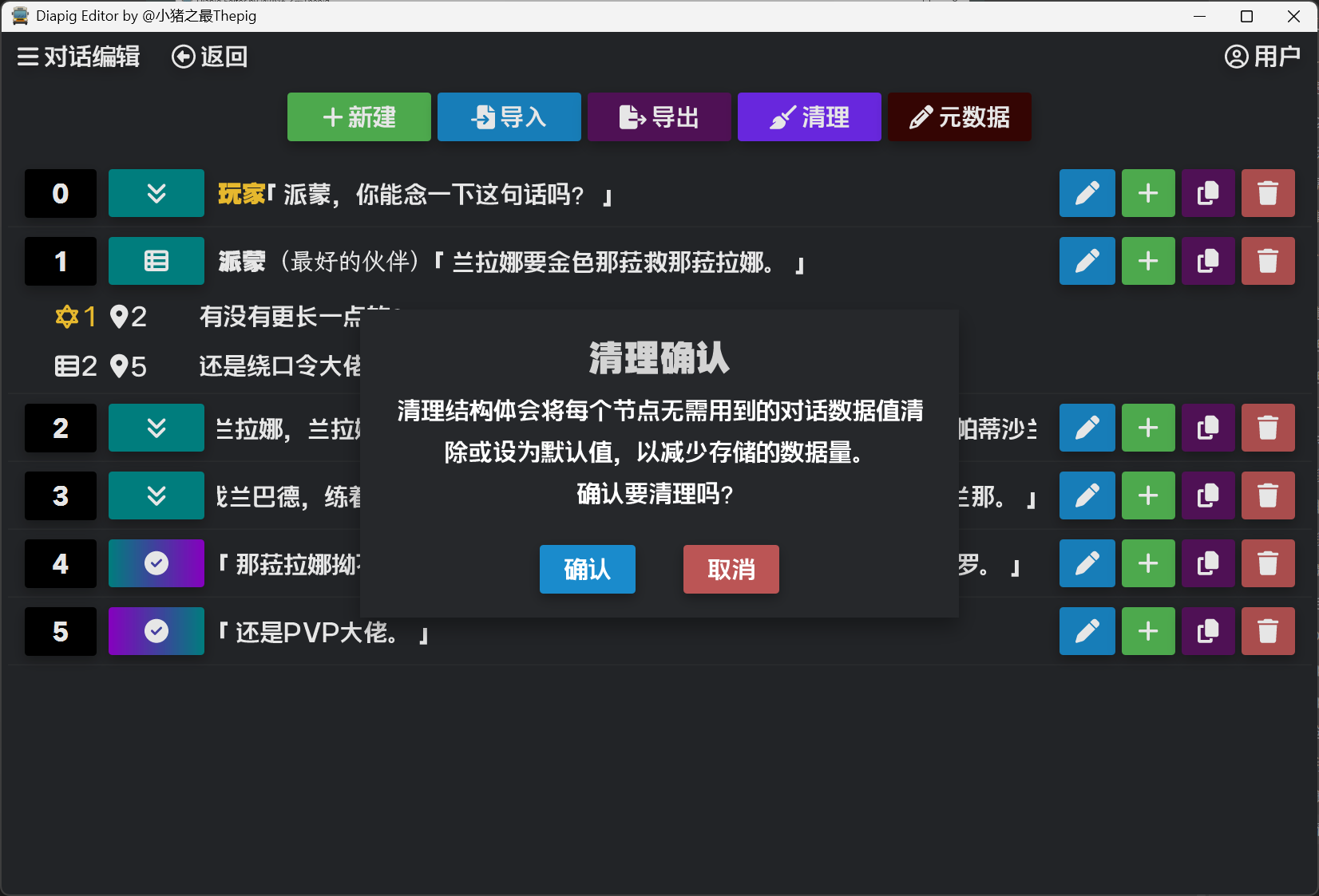 对话节点结构体的构造较为特殊,有时会包含一些「用不到」的值(例如没有副标题的对话节点的副标题可能不为空)。此时使用界面顶部的清理功能即可将这些值置空或置零,可以略微降低结构体读取相关的负载占用。