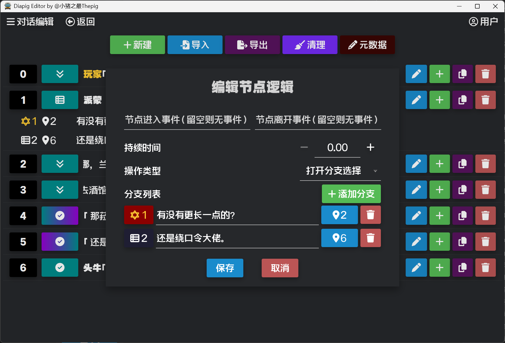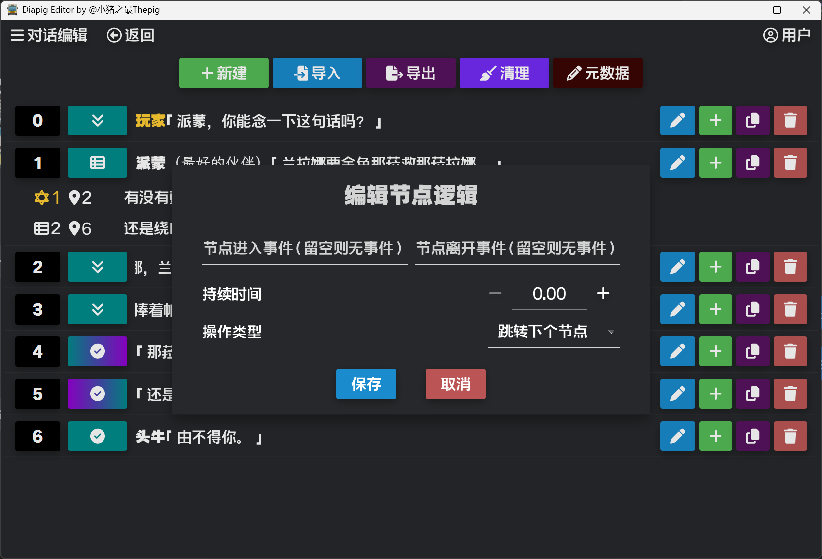 点击节点左侧的对话操作与事件按钮,可以在弹出窗口中编辑该节点的操作与事件相关参数。编辑完后记得点保存!所有更改只有点了保存才会生效!