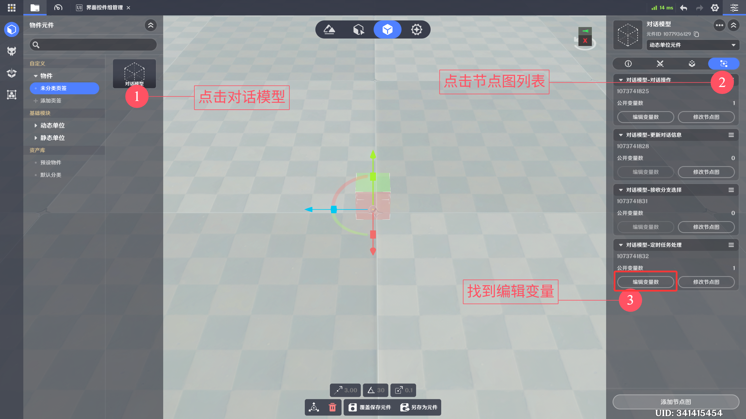 - 在编辑器的元件库中,找到「对话模型」元件,打开节点图列表,找到对应节点图的编辑变量按钮。