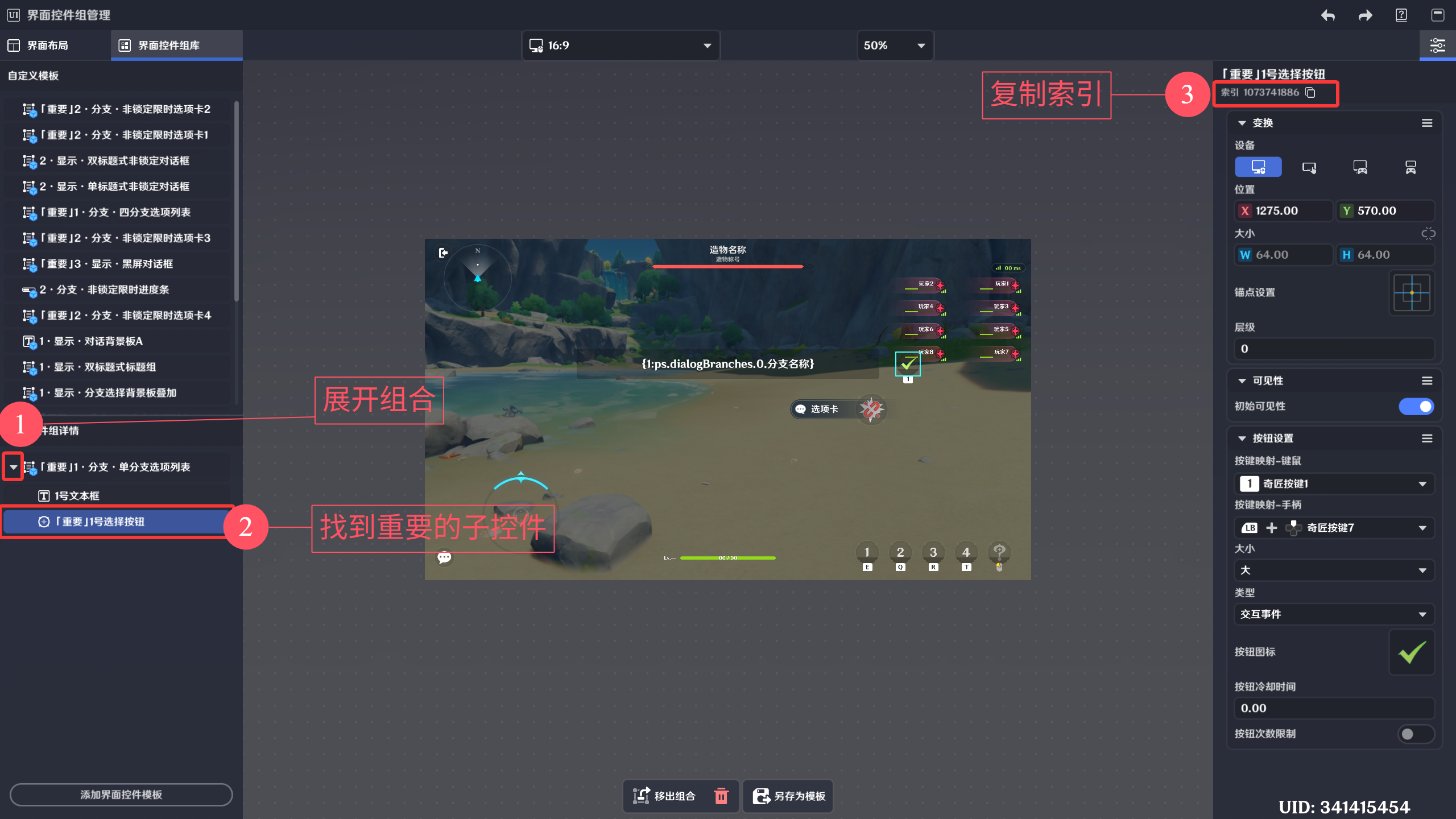由于千星奇域自身导入导出界面控件组时,界面控件组索引可能变化的特性,以及作者编写节点图时尽可能通过变量传参简化控件显示与消失的习惯,部分界面控件在通过 gia 导入后需要在引用它们的节点图的节点图变量中重新填写索引。